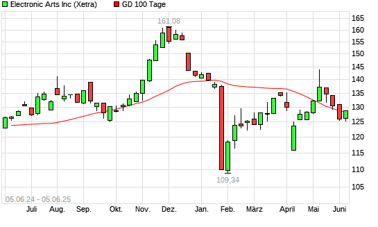 Mit dem Anstieg auf 129,06 EUR hat die Electronic Arts-Aktie am 04.06.2025 die 100-Tage-Linie nach oben gekreuzt.