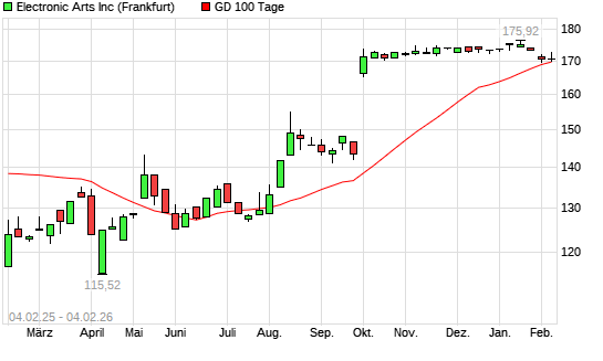 Mit dem Anstieg auf 172,42 EUR hat die Electronic Arts-Aktie am 03.02.2026 die 100-Tage-Linie nach oben gekreuzt.