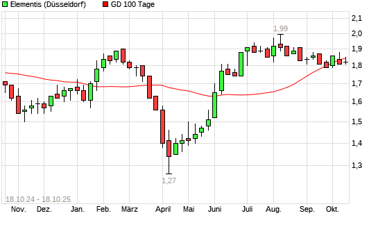 Mit dem Anstieg auf 1,83 EUR hat die Elementis-Aktie am 17.10.2025 die 100-Tage-Linie nach oben gekreuzt.