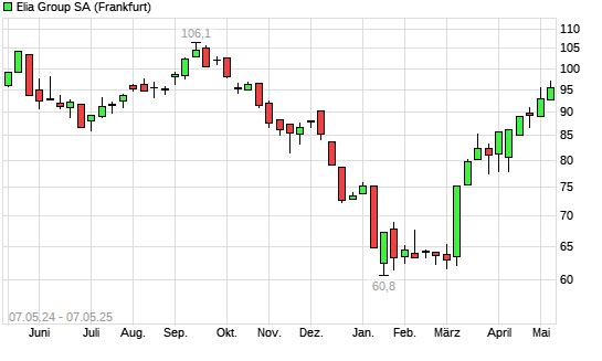 Mit dem Anstieg auf 96,65 EUR hat die Elia System Operator-Aktie (ISIN BE0003822393) am 06.05.2025 ein neues 6-Monats-Hoch erreicht und damit den Kurs vom 30.04.2025 eingestellt.