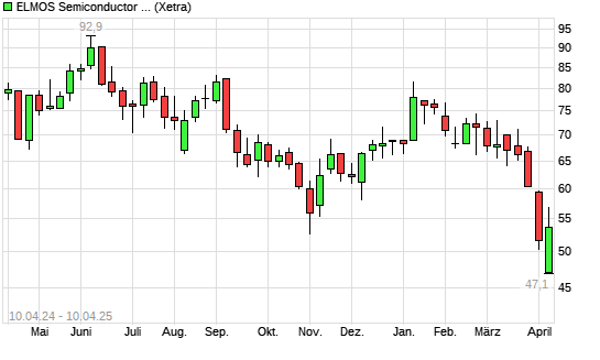 Mit dem Rücksetzer auf 49,25 EUR hat die Elmos Semiconductor-Aktie (ISIN DE0005677108) am 09.04.2025 ein neues 12-Monats-Tief erreicht und damit den Kurs vom 07.04.2025 eingestellt.
