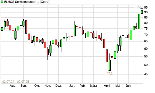 Mit dem Anstieg auf 92,60 EUR hat die Elmos Semiconductor-Aktie (ISIN DE0005677108) am 02.07.2025 ein neues All-Time-High erreicht und damit den Kurs vom 11.04.2023 eingestellt.