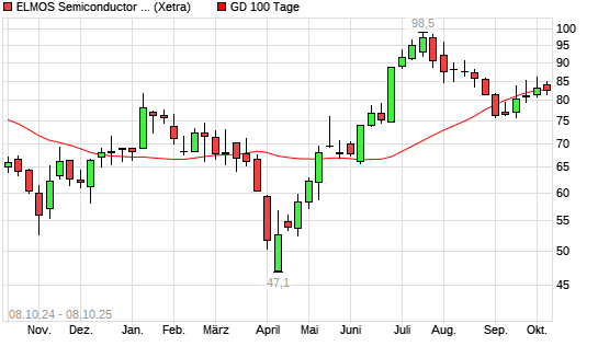 Mit dem Rücksetzer auf 82,40 EUR hat die Elmos Semiconductor-Aktie am 07.10.2025 die 100-Tage-Linie nach unten gekreuzt.