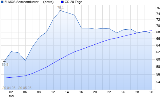 Mit dem Rücksetzer auf 68,10 EUR hat die Elmos Semiconductor-Aktie am 29.05.2025 die 20-Tage-Linie nach unten gekreuzt.
