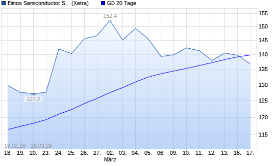 Mit dem Rücksetzer auf 136,60 EUR hat die Elmos Semiconductor-Aktie am 17.03.2026 die 20-Tage-Linie nach unten gekreuzt.