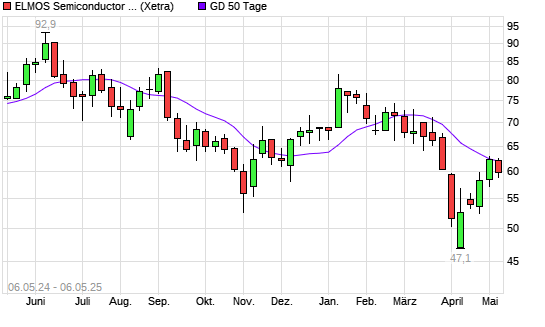 Mit dem Rücksetzer auf 61,00 EUR hat die Elmos Semiconductor-Aktie am 05.05.2025 die 50-Tage-Linie nach unten gekreuzt.