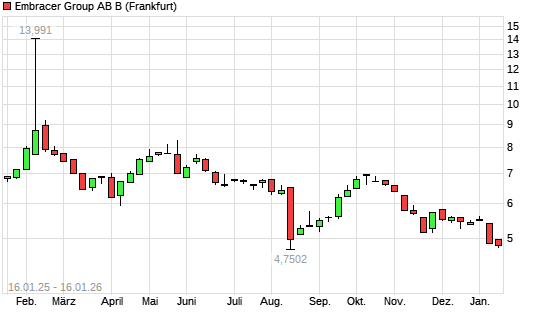Mit dem Rücksetzer auf 4,75 EUR hat die Embracer Group-Aktie (ISIN SE0023615885) am 15.01.2026 ein neues 12-Monats-Tief erreicht und damit den Kurs vom 14.08.2025 eingestellt.