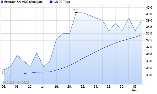 Mit dem Rücksetzer auf 37,40 EUR hat die Embraer ADR-Aktie am 03.02.2025 die 20-Tage-Linie nach unten gekreuzt.