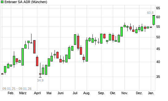 Mit dem Anstieg auf 59,40 EUR hat die Embraer SA ADR-Aktie (ISIN US29082A1079) am 08.01.2026 ein neues All-Time-High erreicht und damit den Kurs vom 05.01.2026 eingestellt.