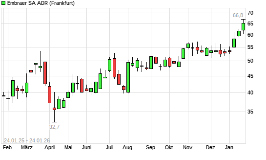 Mit dem Anstieg auf 65,20 EUR hat die Embraer SA ADR-Aktie (ISIN US29082A1079) am 23.01.2026 ein neues All-Time-High erreicht und damit den Kurs vom 22.01.2026 eingestellt.