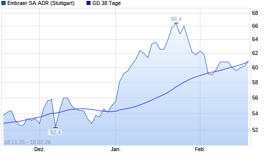 Mit dem Rücksetzer auf 59,00 EUR hat die Embraer SA ADR-Aktie am 17.02.2026 die 38-Tage-Linie nach unten gekreuzt.