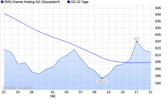 Mit dem Anstieg auf 623,50 EUR hat die Ems-Chemie Holding-Aktie am 20.10.2025 die 20-Tage-Linie nach oben gekreuzt.