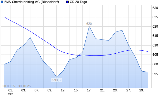 Mit dem Rücksetzer auf 607,00 EUR hat die Ems-Chemie Holding-Aktie am 29.10.2025 die 20-Tage-Linie nach unten gekreuzt.