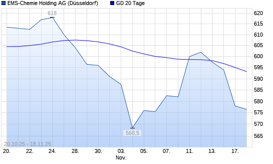 Mit dem Rücksetzer auf 595,50 EUR hat die Ems-Chemie Holding-Aktie am 17.11.2025 die 20-Tage-Linie nach unten gekreuzt.