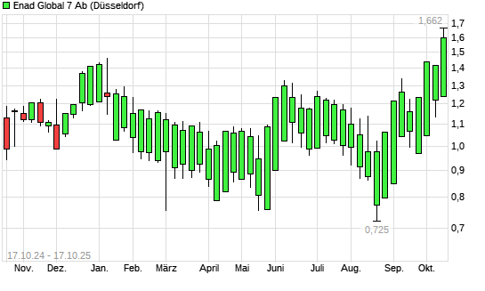 Mit dem Anstieg auf 1,58 EUR hat die Enad Global 7-Aktie (ISIN SE0010520106) am 16.10.2025 ein neues 6-Monats-Hoch erreicht und damit den Kurs vom 08.10.2025 eingestellt.
