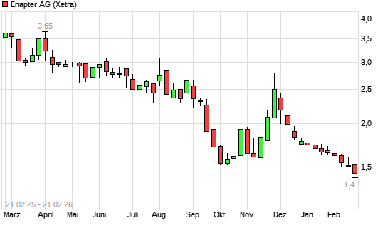 Mit dem Rücksetzer auf 1,42 EUR hat die Enapter (ex S&O Beteiligungen)-Aktie (ISIN DE000A255G02) am 20.02.2026 ein neues 5-Jahres-Tief erreicht und damit den Kurs vom 03.10.2025 eingestellt.