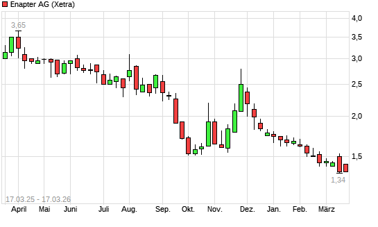 Mit dem Rücksetzer auf 1,33 EUR hat die Enapter (ex S&O Beteiligungen)-Aktie (ISIN DE000A255G02) am 16.03.2026 ein neues 5-Jahres-Tief erreicht und damit den Kurs vom 02.03.2026 eingestellt.