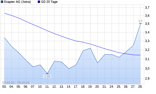 Mit dem Anstieg auf 3,10 EUR hat die Enapter (ex S&O Beteiligungen)-Aktie am 28.03.2025 die 20-Tage-Linie nach oben gekreuzt.