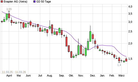 Mit dem Rücksetzer auf 1,49 EUR hat die Enapter (ex S&O Beteiligungen)-Aktie am 10.03.2026 die 50-Tage-Linie nach unten gekreuzt.