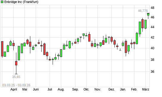 Mit dem Anstieg auf 46,18 EUR hat die Enbridge-Aktie (ISIN CA29250N1050) am 02.03.2026 ein neues 10-Jahres-Hoch erreicht und damit den Kurs vom 16.02.2026 eingestellt.