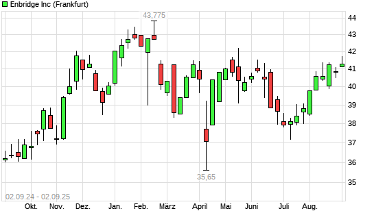 Mit dem Anstieg auf 41,35 EUR hat die Enbridge-Aktie (ISIN CA29250N1050) am 01.09.2025 ein neues 6-Monats-Hoch erreicht und damit den Kurs vom 03.06.2025 eingestellt.