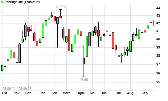Mit dem Anstieg auf 42,43 EUR hat die Enbridge-Aktie (ISIN CA29250N1050) am 24.09.2025 ein neues 6-Monats-Hoch erreicht und damit den Kurs vom 23.09.2025 eingestellt.