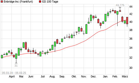 Mit dem Rücksetzer auf 39,51 EUR hat die Enbridge-Aktie am 04.03.2025 die 100-Tage-Linie nach unten gekreuzt.