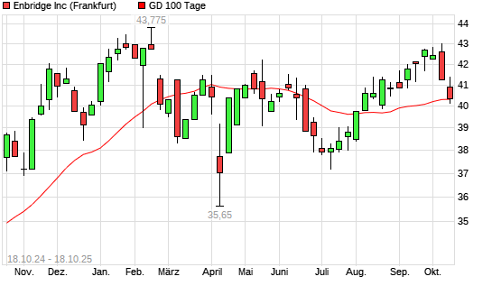 Mit dem Rücksetzer auf 40,02 EUR hat die Enbridge-Aktie am 17.10.2025 die 100-Tage-Linie nach unten gekreuzt.
