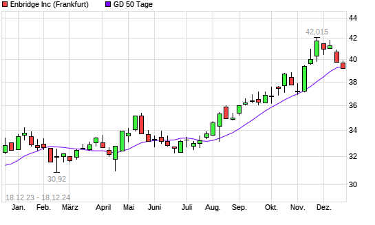 Mit dem Rücksetzer auf 39,13 EUR hat die Enbridge-Aktie am 17.12.2024 die 50-Tage-Linie nach unten gekreuzt.