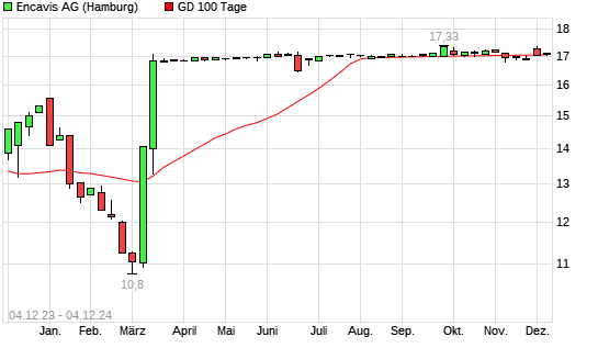 Mit dem Anstieg auf 17,14 EUR hat die Encavis-Aktie am 03.12.2024 die 100-Tage-Linie nach oben gekreuzt.