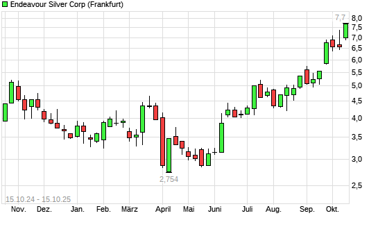 Mit dem Anstieg auf 7,70 EUR hat die Endeavour Silver-Aktie (ISIN CA29258Y1034) am 14.10.2025 ein neues 10-Jahres-Hoch erreicht und damit den Kurs vom 13.10.2025 eingestellt.