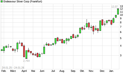 Mit dem Anstieg auf 11,91 EUR hat die Endeavour Silver-Aktie (ISIN CA29258Y1034) am 23.01.2026 ein neues All-Time-High erreicht und damit den Kurs vom 22.01.2026 eingestellt.