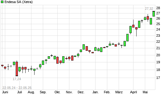 Mit dem Anstieg auf 27,02 EUR hat die Endesa-Aktie (ISIN ES0130670112) am 21.05.2025 ein neues All-Time-High erreicht und damit den Kurs vom 08.05.2025 eingestellt.