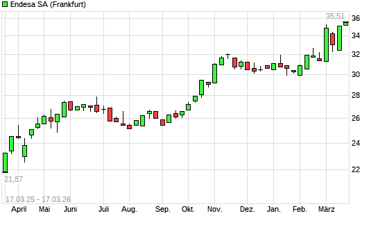 Mit dem Anstieg auf 35,51 EUR hat die Endesa-Aktie (ISIN ES0130670112) am 16.03.2026 ein neues All-Time-High erreicht und damit den Kurs vom 13.03.2026 eingestellt.