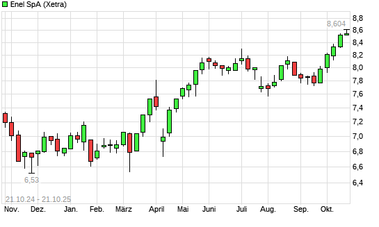 Mit dem Anstieg auf 8,57 EUR hat die Enel-Aktie (ISIN IT0003128367) am 20.10.2025 ein neues 3-Jahres-Hoch erreicht und damit den Kurs vom 16.10.2025 eingestellt.
