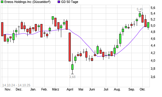 Mit dem Rücksetzer auf 4,90 EUR hat die Eneos-Aktie am 13.10.2025 die 50-Tage-Linie nach unten gekreuzt.