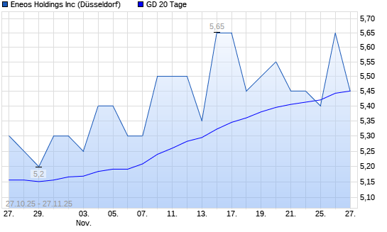 Mit dem Anstieg auf 5,65 EUR hat die Eneos-Aktie am 26.11.2025 die 20-Tage-Linie nach oben gekreuzt.Die Eneos-Aktie befindet sich seit dem 06.08.2025 im langfristigen Aufwärtstrend und hat in ...weiterlesen