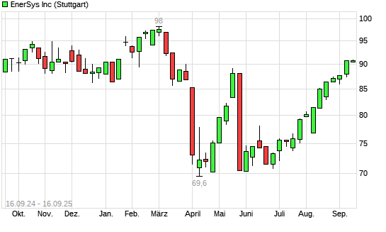 Mit dem Anstieg auf 91,00 EUR hat die EnerSys-Aktie (ISIN US29275Y1029) am 15.09.2025 ein neues 6-Monats-Hoch erreicht und damit den Kurs vom 12.09.2025 eingestellt.