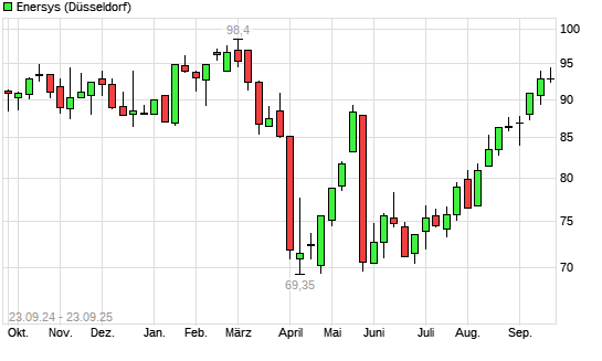 Mit dem Anstieg auf 93,50 EUR hat die EnerSys-Aktie (ISIN US29275Y1029) am 22.09.2025 ein neues 6-Monats-Hoch erreicht und damit den Kurs vom 19.09.2025 eingestellt.