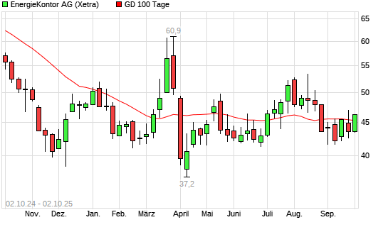 Mit dem Anstieg auf 45,75 EUR hat die Energiekontor-Aktie am 01.10.2025 die 100-Tage-Linie nach oben gekreuzt.