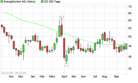 Mit dem Anstieg auf 46,50 EUR hat die Energiekontor-Aktie am 03.10.2025 die 200-Tage-Linie nach oben gekreuzt.