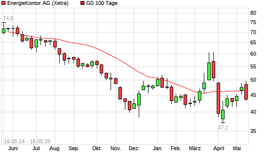 Mit dem Rücksetzer auf 45,25 EUR hat die Energiekontor-Aktie am 15.05.2025 die 100-Tage-Linie nach unten gekreuzt.