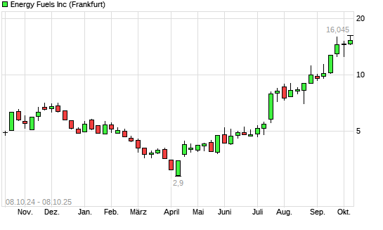 Mit dem Anstieg auf 15,05 EUR hat die Energy Fuels-Aktie (ISIN CA2926717083) am 07.10.2025 ein neues 10-Jahres-Hoch erreicht und damit den Kurs vom 25.09.2025 eingestellt.