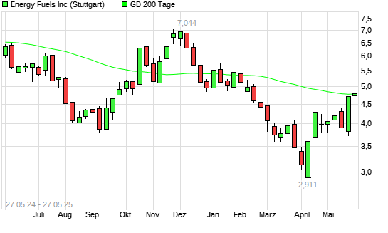 Mit dem Anstieg auf 5,00 EUR hat die Energy Fuels-Aktie am 26.05.2025 die 200-Tage-Linie nach oben gekreuzt.