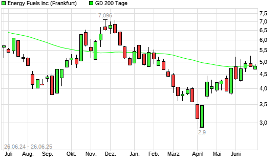 Mit dem Anstieg auf 4,88 EUR hat die Energy Fuels-Aktie am 25.06.2025 die 200-Tage-Linie nach oben gekreuzt.