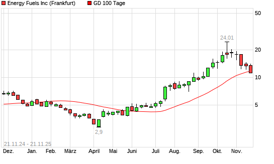 Mit dem Rücksetzer auf 11,45 EUR hat die Energy Fuels-Aktie am 20.11.2025 die 100-Tage-Linie nach unten gekreuzt.