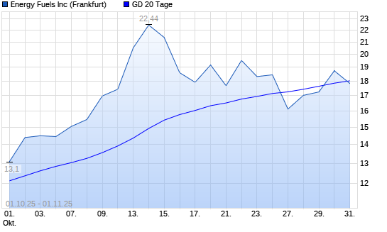 Mit dem Rücksetzer auf 17,82 EUR hat die Energy Fuels-Aktie am 31.10.2025 die 20-Tage-Linie nach unten gekreuzt.
