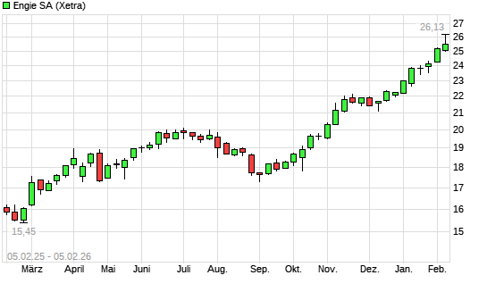 Mit dem Anstieg auf 26,08 EUR hat die Engie-Aktie (ISIN FR0010208488) am 04.02.2026 ein neues 10-Jahres-Hoch erreicht und damit den Kurs vom 03.02.2026 eingestellt.