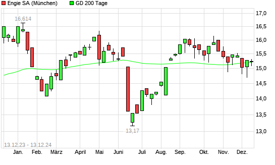 Mit dem Rücksetzer auf 15,13 EUR hat die Engie-Aktie am 12.12.2024 die 200-Tage-Linie nach unten gekreuzt.