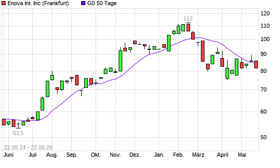 Mit dem Rücksetzer auf 84,50 EUR hat die Enova-Aktie am 21.05.2025 die 50-Tage-Linie nach unten gekreuzt.